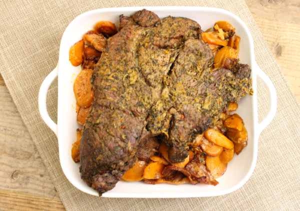 Place the chopped vegetables and marinated meat in an oven-safe dish